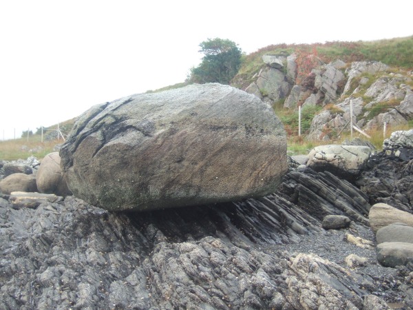 Geology time: a glacial erratic boulder of gneiss (probably Lewisian ie extremely old) sitting on Moine schists and psammites (very old)
