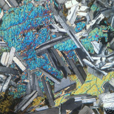 And the same stuff again, this time in crossed polars, looks quite coloirful doesnt it? Amazing how a dull looking piece of rock can appear when ground thin and seen through the microscope: