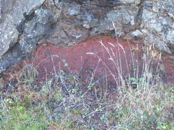 The red colour really stands out. That's the top of an old lava flow that you are looking at there. Would have been impressive at the time it was being poured out...