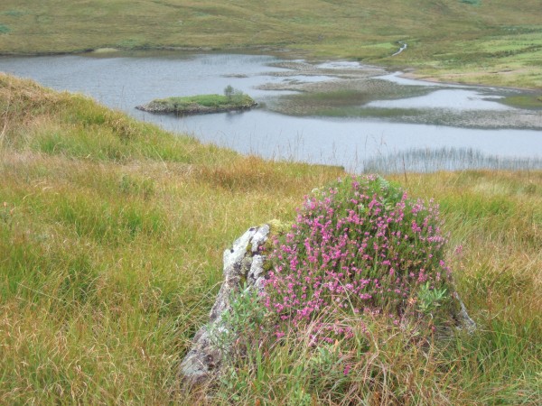 One last view of Loch Sguaban and the crannog from a heathery knoll.