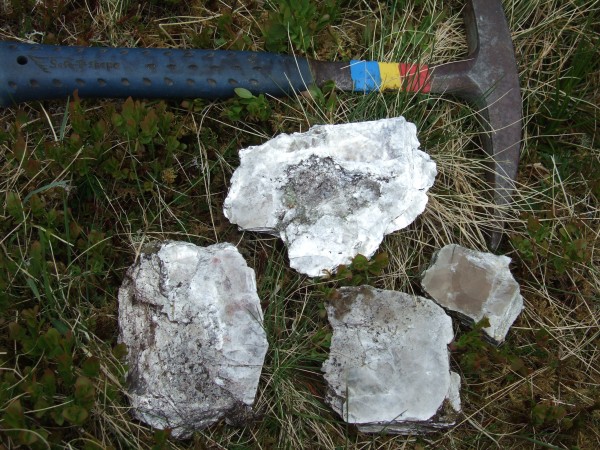 Now this is the stuff I was after - a really coarse granite called pegmatite, full of huge crystals of quartz and feldspar and of course, great chunks of mica. Some of them are up to 6 inches across. Very impressive
