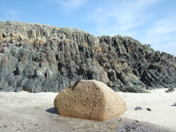 A very fine erratic boulder of Ross of Mull granite sits on the shore. Vertically bedded Torridonian sediments behind