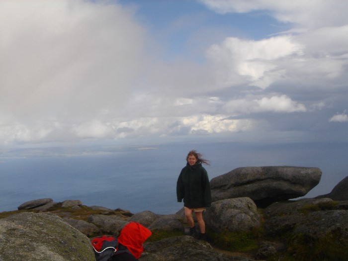 Met Julie ant Sylv at the summit. It was very windy and the cloud had the cheek to come down and spoil the view. Typical! It took vitrually the same time from both routes. The Corrie route is much shorter but steeper, the Brodick route is definitely easier.