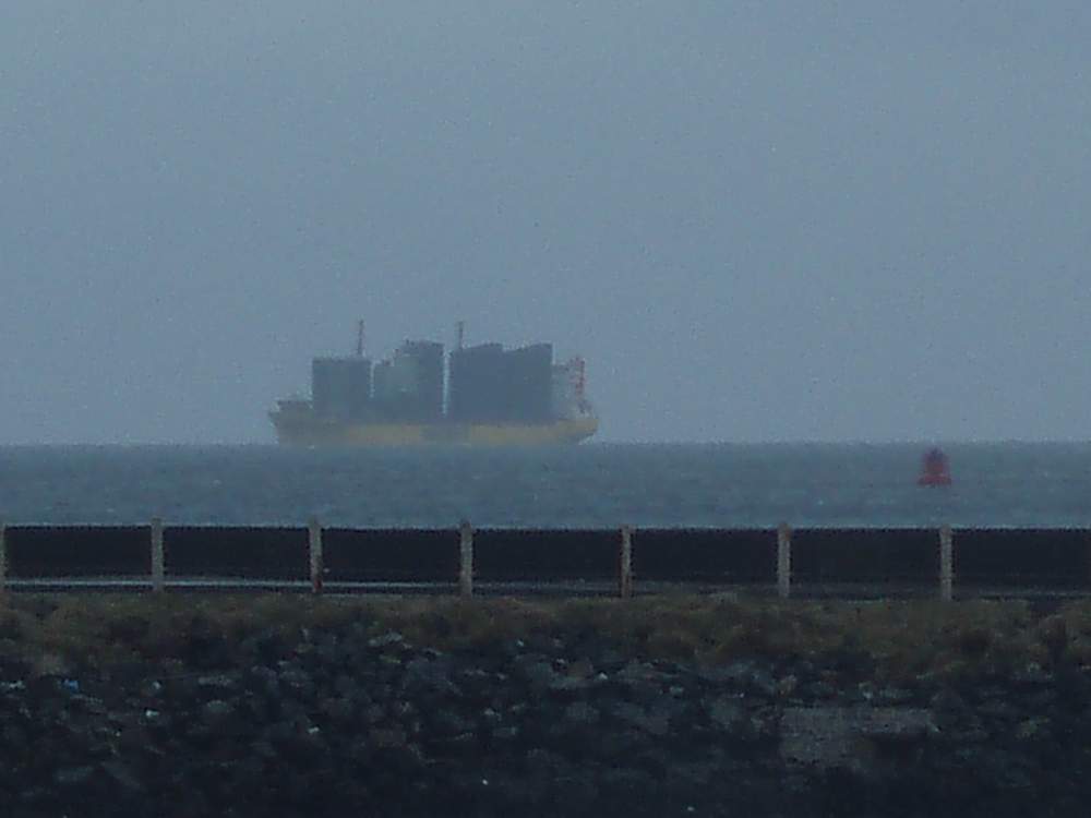 Since Friday evening, we have this rather large ship sheltering off Stornoway. On Saturday, conditions cleared up sufficiently to allow me to see it clearly through binoculars. The company name on its side read Big Lift.