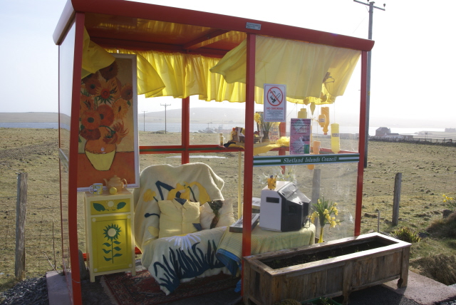 The Unst Bus Shelter (we have more than one bus shelter in Unst but this one deserves the definite article) is known locally as Bobby's Bus Shelter. It is one of Unst's premier visitor attractions, and the visitor book is well worth a read, usually studded with the witty comments of many well travelled tourists. Frequently throught the summer months you can see people posing inside for a photo that will bring back memories of Unst's quirky sense of humour.