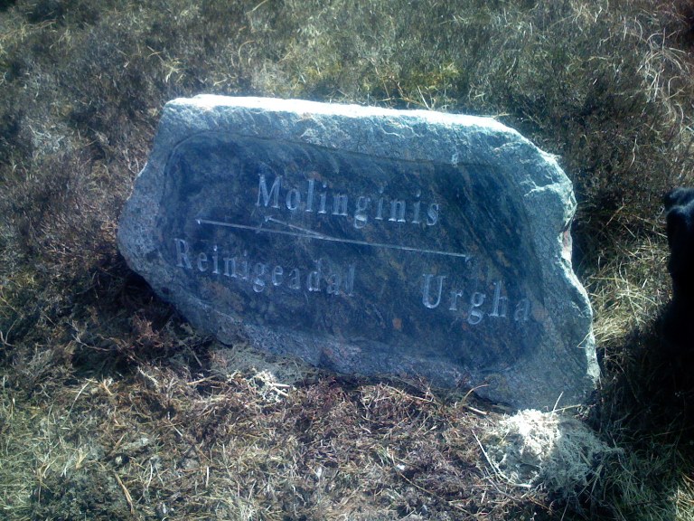 The North Harris Trust have carried out a huge operation to renovate the track all the way from Urgha to Reinigeadal and the track is now better than it ever was in living memory. At the junction where the track to Molinginish leaves the main track they have erected this beautiful direction stone. Commissioned by the Trust and executed by the now famous Jon Hearach it was lifted by helicopter earlier this year and set in position where it will remain for many a year to come. No excuses for going astray now!