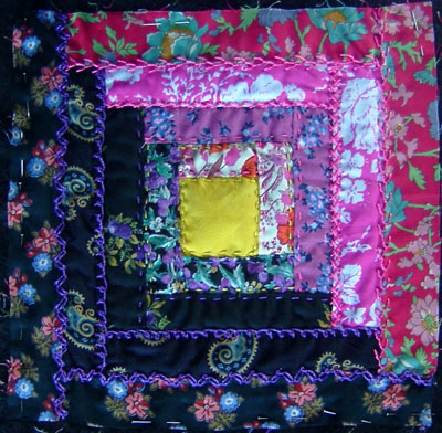 I have never made a sample quilt and have wanted too, some members of the Lewis quilt group have started making a sample quilt and log cabin was the first block, we are working all the blocks by hand so I decided to use commercial fabrics from my stash and as I am hand sewing and I like embroidery stitching, I decided to join my block with embroidery stitches, I want it to have a period look,