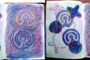 Some may remember my post about the rock art in the cave on Mull, I recently found a book on rock art in Stornoway library and it explained quite a lot about it, there are lots on Orkney, it was done by ‘hunter gatherers’ about 3,000-5,000 years BC and the holes are known as cups, last night I made some printing blocks using some of the designs and I took them and lots of art stuff over to Jane’s and just tried things out, I want to do more playing but ideas for stitched stuff are forming, just for now here are pages from my textile sketch book,