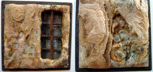 And this is one of my favourite shapes, I have made it dumpier than the original as that was the size of the piece of corrugated card that I had, it didn’t print well so the prints have been worked into with other stuff and I cut up the block and put the shapes on a painted background, I like the corded effect,