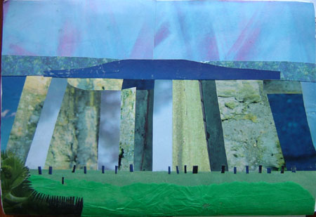 the tutor gave us homework one weekend to use our sketches and make pictures with cut papers one in cool colours so I used the Benbecula drawing and used mostly magazine papers,