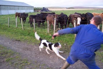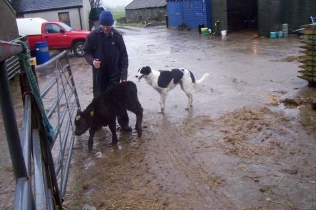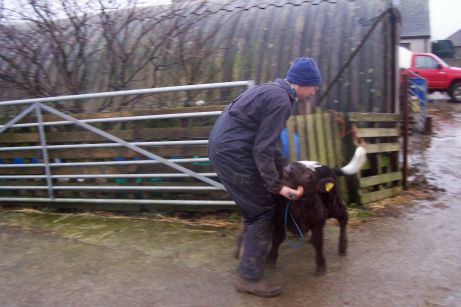 Erlend came bursting out of the side door of the byre being towed by a very wild calf! You wouldn't BELIEVE how strong these little buggers are! (Zeb is trying his best to herd the calf but he's far more Borzoi then Collie!!)