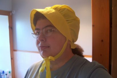 I have a whole variety of bonnets in all sorts of prints and colors. I just LOVE them! They are old-fashioned but who cares! (Hmmm. I look a bit cheeky in this photo. I was trying to take a picture of myself which isn't easy!!)
