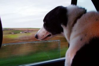 Here is Zeb taking his first look at Orkney as we head back to the farm from the ferry. He enjoyed the ferry so much he peed all over himself and was having a mental breakdown when we fetched him from the ferry kennel. We'll never take him on a boat again!!!!