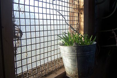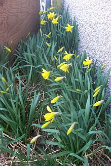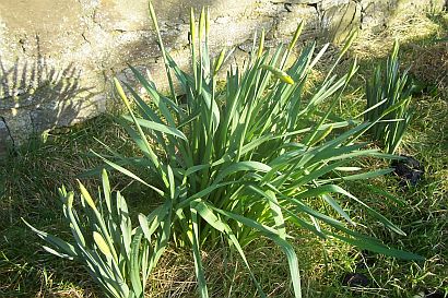A row of daffodils along the side of the old stone tied byre. I wonder when they will bloom?? We have huge clumps of daffodils all over the farm! (And other mysterious flowers...)