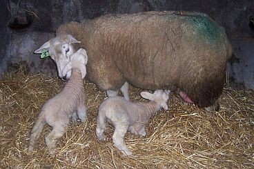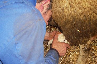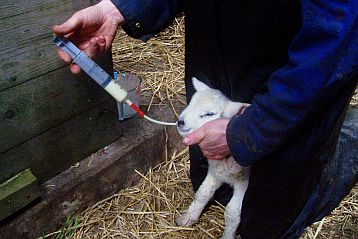 Erlend then took the beesmilk and put it into a big syringe and then, after passing a tube down into the ram lamb's stomach, he fed the little boy his first meal! He also gave the lambs a jag of Vitiman E and soon enough the ram was merrily sooking away with his sister!