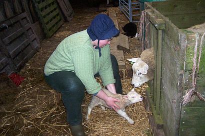 I took the lamb to Elsie and even before it reached her she was sticking her tongue out and trying to lick it! She is a good mother! Erlend delivered the next lamb and it was a ram! He had a much slower start then the yow lamb and he refused to sook. We left them alone for a while but when I checked back half an hour later I found the yow lamb bursting with a tummy full of milk and the ram lamb skinny, cold and empty of milk.
