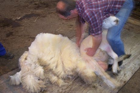 The sheep was eased this way and that - it seemed as if she were being slowly rolled out of her fleece! (You can see a muzzle poking out behind his knee...)