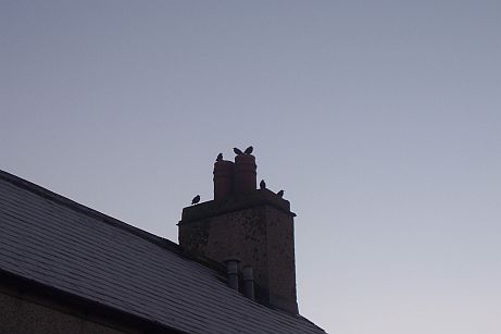 Orcadian starlings gather to discuss the weather before they raid the cattle silage and steal all of the grain.