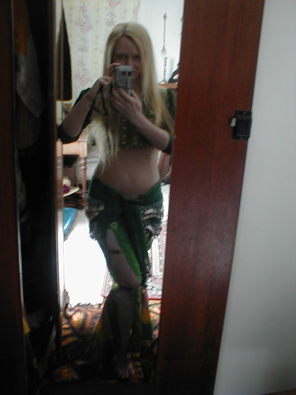 I am still making the shimmy belt for the pink silk costume, so that`s still to go around the hips. There`s also a matching veil on the go for the new green skirt and belt set. :-)