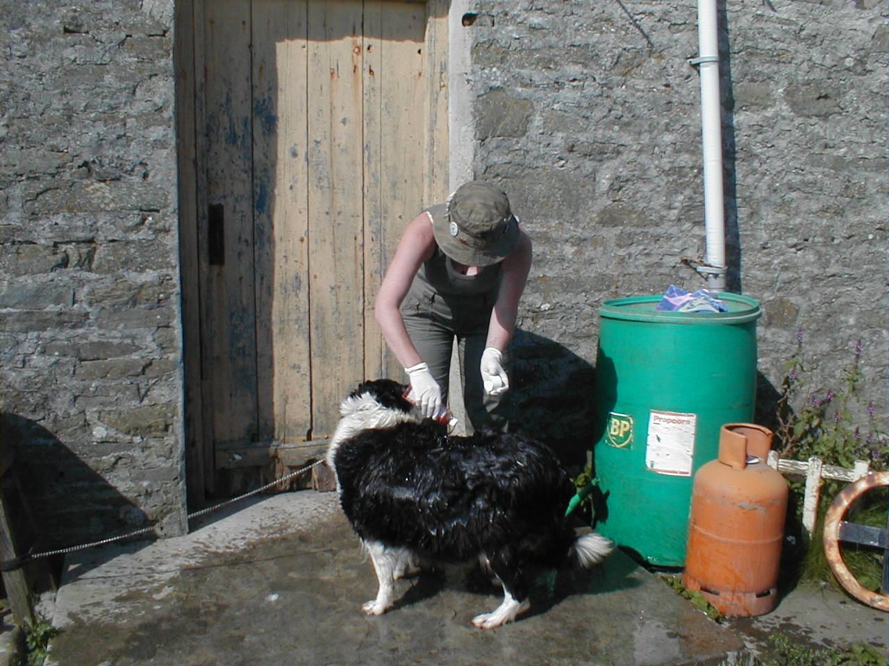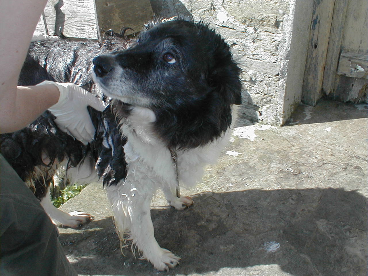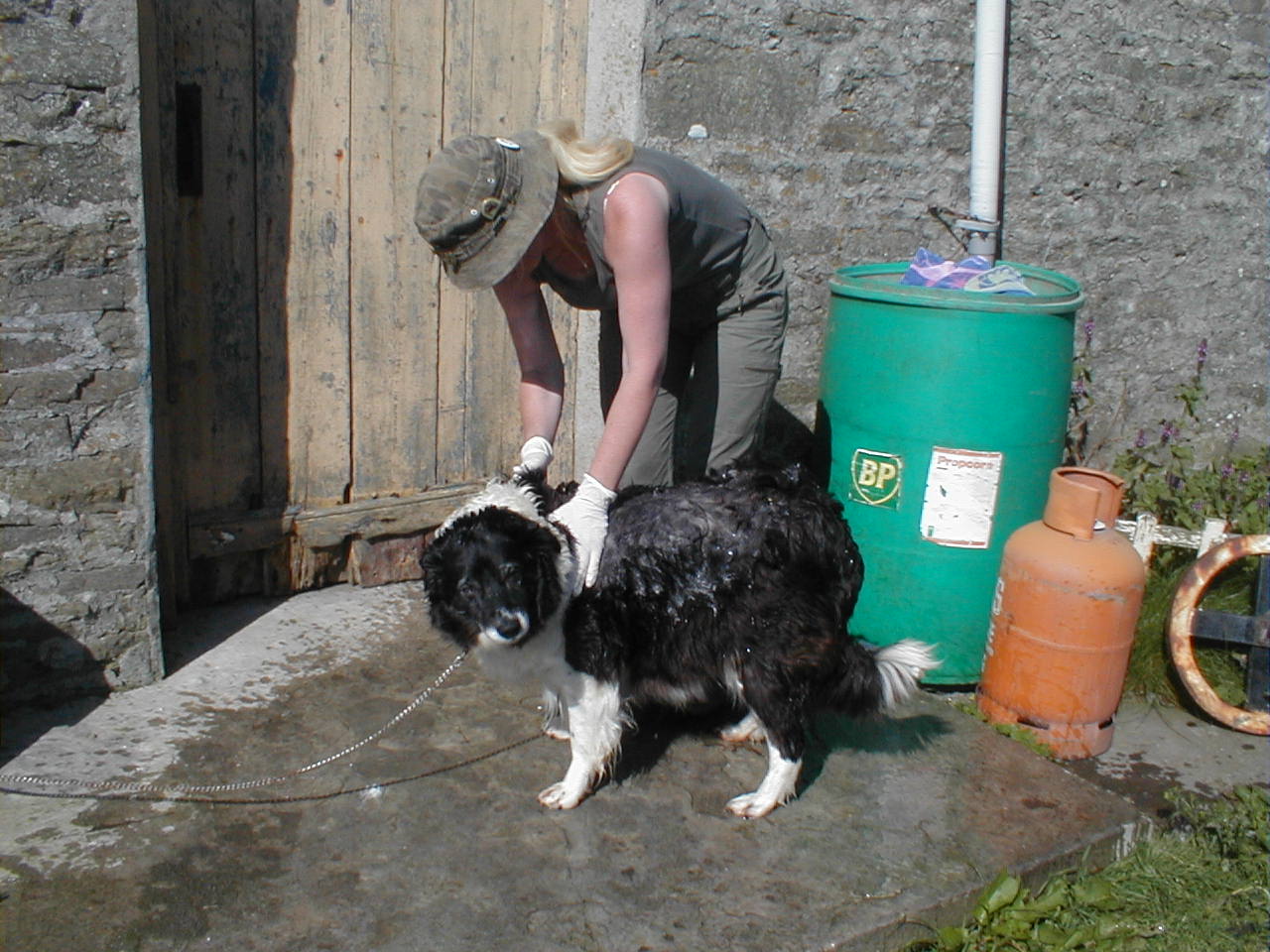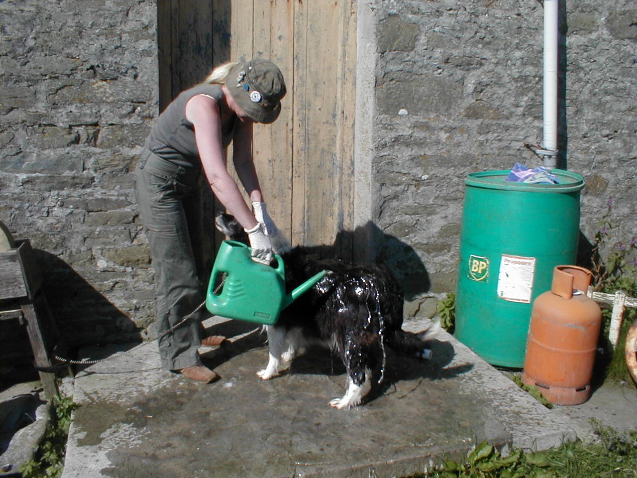 so nothing for it but to bath her. So here are some pics of one wet dog looking reproachfully at me, not liking being washed. And I dinnae blame her one wee bit. And afterwards, it being braw and sunny, I pegged her out on the front lawn so the sun would dry her quicker. And what did she do? Yup. Ate a snail, spat out the shell then dug a hole to bury it.....
