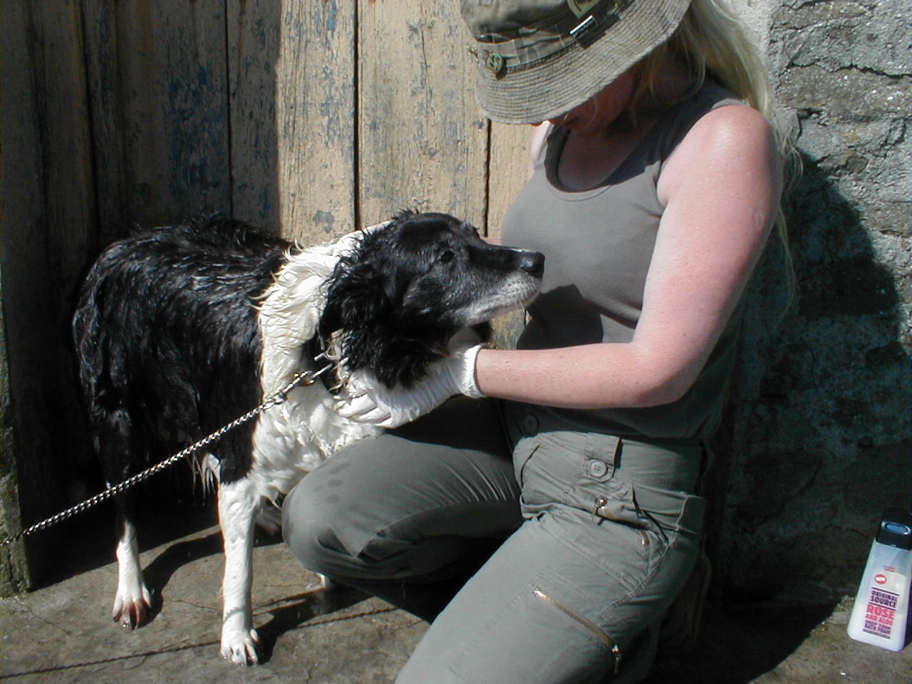 And she sleeps ON the dog...a living cushion. So this morning when I went to stroke Lassie`s back, it came away with a huge `yuck!` factor, for she was covered in cat snot!