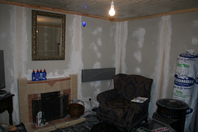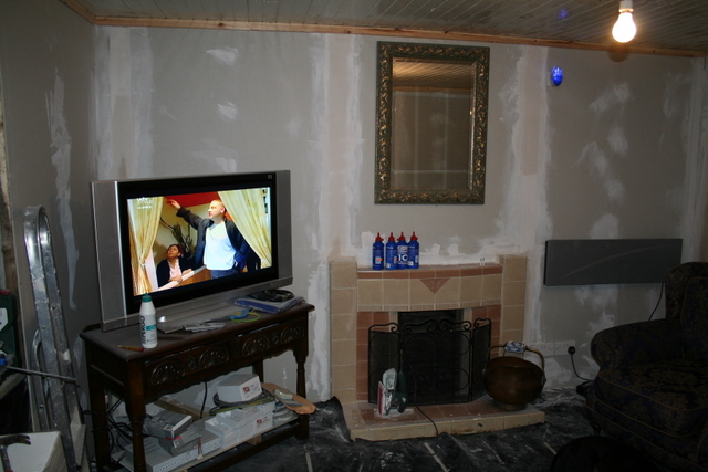 Ok here are a couple of Pictures, I have completed all the studwork and drylinging including electrics as the materials turned up on Tuesday so only lost 1 day.......as you can see the fire surround has been cleaned up and re grouted, and my suite is on its legs again after being store sideways for 4 weeks.....wow we have been here 1 month now?, on Monday the new suite turns up as this one is just not working out it is too big so it has to go. OH by the way I have taken a pic of my HD ready LCD screem for MJC LOL :o)