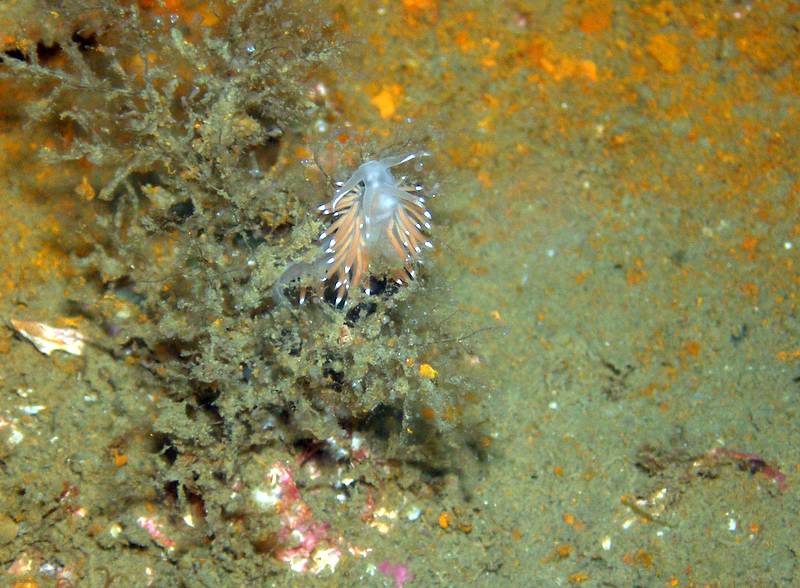 I love slugs. If i could hug one, i would, but these are no ordinary slugs - they are underwater slugs, otherwise known as nudibranches. Nudibranch means "naked lung", as these animals breathe through gills held on their backs wafted in the oxygen rich water. They come in every conceivable size and shape and colour, slowly munching their way over the algae covering of the huge artificial reefs in Scapa Flow. The largest found in UK waters is Tritonia hombergii (excuse the spelling) which can grow to around the size of a golf ball. More commonly they are tiny, anything from a speck you can barely see to a couple of centimeters long sometimes with fabby "dreadlocks" of all colours - these are the ones i like the best.