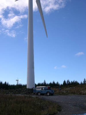 "What with the debate on wind farms still raging on Island Blogging I thought I'd submit a couple of pictures from a recent trip up into the hills above Carradale, to Deucheran Hill in fact, where one of Kintyre's windfarms is sited. Both pictures (attached) show turbine number 8. In one you can see the turbine 'head' clearly whereas in the other our Landrover is shown to add a bit of scale."