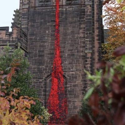 Rev. Liz Byrne and Debbie Stott talk to Paul about their cascading poppy installation.