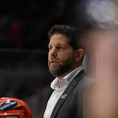 Sheffield Steelers head coach Aaron Fox speaking to Peter Spencer, after their 4-0 defeat to Belfast Giants.
