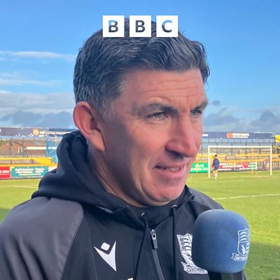 The Southend United head coach Kevin Maher after securing a trip to Wembley in the FA Trophy Final. The Blues beat National League North side Southport 3-1 and they will face Wealdstone in the final on the 17th May. (Image credit: Warren Muggleton/BBC)
