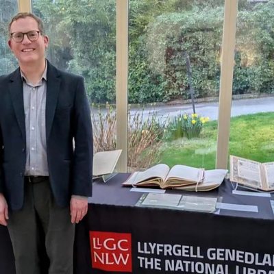 Rob Phillips yn trafod y deunydd etholiadol yn yr Archif Wleidyddol Gymreig