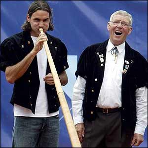 ![]() | Blowing his trumpet Federer was famously given a cow when he turned up to his home tournament in Gstaad after his first Wimbledon win. It was an alphorn that he was presented with before the 2004 tournament - which he went on to win by beating Russian Igor Andreev 6-2 6-3 5-7 6-3. |