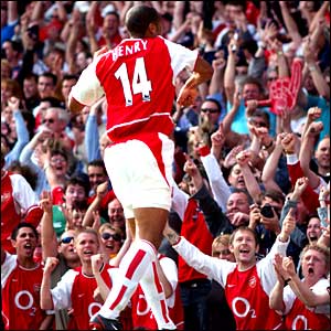![]() | The adulation Henry's goals and exemplary sporting attitude have helped make him the darling of Highbury. There is a buzz of anticipation whenever he drifts into his favoured left-hand channel and threatens to leave defenders trailing with his express speed. More often than not the crescendo of noise becomes a roar when the net billows after yet another goal. |