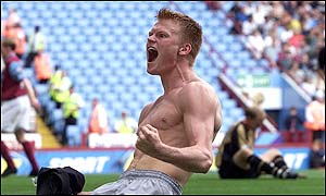 | Sunday, 18 August, 2002, 15:02 GMT 16:02 UK Riise edges out Villa ![]() John Arne Riise celebrates Liverpool's winner Aston Villa 0-1 Liverpool Liverpool's pursuit of the Premiership title opened in typical fashion as John Arne Riise's strike gave them victory at Aston Villa. Norway international Riise delivered a trademark Liverpool counter punch two minutes into the second half to give Gerard Houllier's side the three points. Liverpool even allowed themselves the luxury of seeing Michael Owen's penalty saved by Villa goalkeeper Peter Enckelman as they cruised to victory. Enckelman gave a virtuoso performance for Graham Taylor's side to deny Liverpool victory by an even greater margin. Liverpool boss Houllier will have been delighted with his side's display, and the excellent showing of striker El-Hadji Diouf, who was preferred to Emile Heskey.