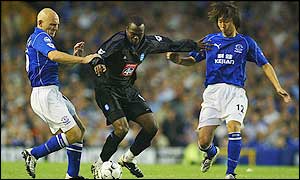 | Wednesday, 28 August, 2002, 20:58 GMT 21:58 UK Ten-man Everton grab point ![]() Stern John's penalty gave Birmingham the lead Everton 1-1 Birmingham A Birmingham own goal in the dying seconds of their game against Everton denied the Midlands side their first win of the season. Everton midfielder David Unsworth's 25-yard shot rebounded off the Blues woodwork before striking defender Kenny Cunningham on its way into the visitors' goal. The goal came as reward for 10 man Everton's late pressure after they went behind to a 49th minute Stern John penalty.