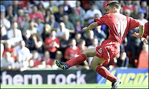 | Saturday, 21 September, 2002, 15:55 GMT 16:55 UK Baros ends Liverpool frustration ![]() Michael Owen misses a Liverpool penalty Liverpool 2-0 West Brom Milan Baros saved Liverpool's blushes with the vital opening goal against a West Brom side who were down to 10-men for most of the game. Baros, making his first Anfield start, scored with a header early in the second half to end Liverpool's frustration against their dogged opponents. West Brom had earlier seen keeper Russell Hoult red-carded after 34 minutes for a professional foul on Michael Owen, who missed the resultant spot-kick.