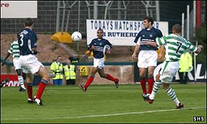 Celtic took the lead in the 18th minute courtesy of a fabulous Henrik Larsson strike. The Swede picked out Guppy in the box with a great cross-field ball after some good work by Petrov and Momo Sylla and collected a return pass before casually clipping an inch-perfect shot over Dundee keeper Julian Speroni. Celtic continued to threaten as Sylla shot wide and Chris Sutton headed Guppy's free-kick straight at a grateful Speroni. Stilian Petrov should have doubled the lead when he exchanged passes with Sutton on the edge of the box and found himself clean through, but screwed his shot past the post. Dundee almost pulled themselves back on level terms just before the break when Joos Valgaeren headed Gavin Rae's pass into the path of Novo, but the Spaniard drove into the side-netting. Celtic's dominance was more pronounced in the second period as Martin O'Neill's men went looking for another goal. Speroni had to move swiftly to push away a header from Sutton which was bound for the bottom corner after a great run and cross from Guppy. Petrov came close after 69 minutes but his cute lob from the edge of the penalty area hit the crossbar and Speroni was able to retrieve the ball. Fabian Caballero gave the visitors a reminder of their slender lead when he flashed a dangerous shot wide of the post from 25 yards out. Soon after arriving as a substitute John Hartson bundled his way through the Dundee defence but dragged his shot wide of the mark from a tight angle. Dundee: Speroni, MacKay, Smith, Hutchinson (Lovell 79), Novo, Hernandez Santos, Rae, Nemsadze, Caballero, Sara, Wilkie. Booked: Rae. Celtic: Douglas, Valgaeren, Balde, Laursen, Sylla (Crainey 80), Lambert, Lennon, Petrov, Guppy, Larsson, Sutton (Hartson 74). Booked: Lennon. Attendance: 9,483 |
