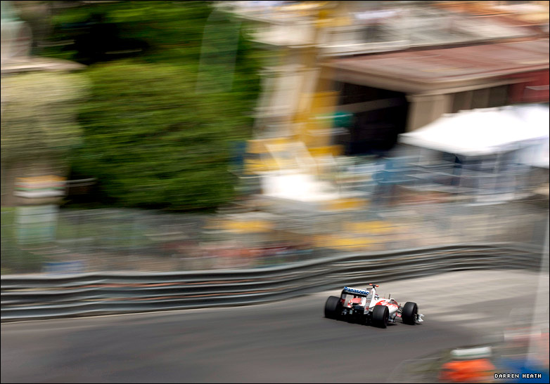 Jarno Trulli speeding along the streets of Monte Carlo in the Monaco Grand Prix is the subject of the latest edition in our series of photographs aimed at conveying Formula 1 in its full glory. The photographs are taken by Darren Heath, who over the last 20 years has carved a reputation as one of the best photographers in F1. This is Darren's story behind his latest image: "Jarno Trulli powers his way out of Casino Square on the steeper than it looks on television run down to the Mirabeau corner. The photographic challenge of Monaco is possibly the best of the year presenting the lensman with an unrivalled array of creative opportunities, making for wonderful scene setting pictures. Seeing F1 cars at blistering speed on such narrow streets is a treat and trying to convey that to the viewer is paramount in my mind when covering the event. This year I was fortunate to have access to a fantastic balcony in the Hotel de Paris overlooking Casino Square affording a fantastic view of the cars as they swing right and power hard away down the short straight that follows. Choosing a very slow shutter speed and panning smoothly the resulting shot works well and, as off the pace as the Toyota team were last weekend, speed is relative with even the slowest cars still mightily impressive." Camera: Canon EOS1DS Mk3. 200mm lens. 1/13th sec @ f22