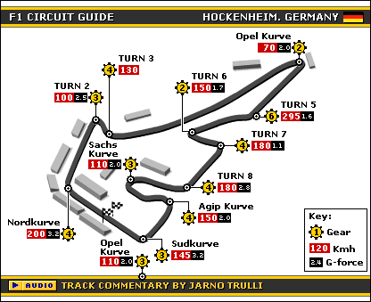 | Location: Hockenheim, Germany Date: 20 July Length: 2.842 miles Rating (out of 10): 4 | Hockenheim lost much of its character when its layout was changed two years ago, abandoning the long blasts into the forest that were its signature. The straights might have been unique but they were also spooky and dangerous, especially in the rain. The changes have, though, provided better racing and improved safety. But what keeps this unlike any other track is the concrete Stadium section, invariably filled with 100,000 klaxon-bearing fans.