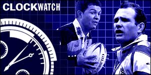 | Saturday, 19 October, 2002, 17:00 GMT 18:00 UK Clockwatch: Bulls 18-19 Saints ![]() All the action as it happened from the Super League Grand Final at Old Trafford. 80 mins: The game ends in controversial circumstances as Bradford claim they should have won a penalty. But the trophy belongs to St Helens. 79 mins: After superb running from Saints, they get the ball to Long on the last tackle and he slots the drop goal home to put his side within touching distance of victory. 78 mins: Sculthorpe is the latest to attempt a drop goal, but once more the effort is off target. 75 mins: James Lowes pushes a kick beyond the Saints defence but can not quite get on the end of it. 74 mins: Deacon goes for the drop goal under pressure and fires wide of the posts. 73 mins: Darren Britt loses the ball in the tackle. He feels the ball has been ripped away but he is not given a penalty. 71 mins: Given so much space and time, Long lines up a drop goal staright in front of the posts, but he misses an easy chance to put Saints ahead. 69 mins: Vaikona is hit by a high tackle, which is ruled to be a shoulder barge by the referee. Paul is floored with cramp as the players start to feel the relentless pace of the match. 67 mins: Saints are stretched in defence and Albert makes another last-ditch tackle to prevent a score. 67 mins: With Albert out of position, Pryce bursts through and looks to be on his way to a score. Bennett manages to catch his legs and bring him down with a try-saving tackle. 65 mins: Saints win a penalty under the posts as McDermott takes the man and not the ball. Long levels the scores. 64 mins: Sculthorpe takes the ball at pace but Brian McDermott halts his progress. 63 mins: Costin's kick goes out of play and Saints earn the put-in in the scrum. 61 mins: Saints defence is solid as Bradford give the ball up after falling shot of the line following their set of six tackles. 60 mins: Hoppe makes an important interception as Costin's pass almost puts Leon Pryce clean through. 57 mins: A difficult kick is made to look difficult as Long fails to haul Saints level. 56 mins: Sculthorpe is held up inches short on the next phase, but the ball goes out wide and Gleeson dives over in the corner. 55 mins: Withers makes a vital stop as Albert looks to have made the breakthrough. 54 mins: Anderson stops Sculthorpe dead in his tracks with a mighty hit. 53 mins: Gleeson shows great strength and vision to burst past three Bulls defenders. But Saints can not take advantage of their good position. 50 mins: Darren Albert tries to run the ball out of defence, but Saints are beginning to look tired. 48 mins: A good kick into open space places St Helens on the back foot. 47 mins: Deacon misses the kick. 47 mins: The Bulls are rampaging through the Saints' defence now. Deacon is instrumental once more and Withers dives over for a score in the corner. 44 mins: Fast hands from Bradford, as Deacon offloads to Anderson, works an opening for Robbie Paul and he gratefully accepts his chance to touch down and help restore his side's lead. Deacon is on target to add the extras. 42 mins: St Helens complete their set of six tackles, but there is a distinct lack of chasers for the kick. 41 mins: Deacon kicks off to start the second half. 40 mins: Deacon appears to be taken out off the ball by Sculthorpe but the illegal challenge is not noticed by the referee. 39 mins: Sculthorpe is caught offside. The Bulls run the ball but Vainikolo is taken into touch as he goes for the corner. 37 mins: Poor handling from Bradford costs them a try-scoring opportunity. They look bewildered by Saints' comeback. 35 mins: Anderson successfully charges down Long's kick. 32 mins: Bradford pay the ultimate price as they dangerously play two long passes along the line just five metres out. Paul Anderson loses the ball in the tackle and Saints profit as the ball goes wide to Long, who goes over unchallenged. Long makes the conversion from the touchline 30 mins: Newlove provides an immovable barrier for Vaikona to run into and the Bradford winger loses the ball as a result. 28 mins: Deacon finds space but there is no second-phase support and a looping pass goes astray. 27 mins: A jinking run from Lee Gilmour takes him past two defenders, but Bradford are forced to kick on the last tackle. 24 mins: The ball squirms free as Sean Hoppe is tackled. Mike Bennett picks up the ball and scores only the second try of his career. The video referee decides the score is legal. Long adds the extras. 23 mins: Long's kick is missed by the Bradford defence and Gleeson collects after the ball after it bounces once. 22 minutes: Deacon makes no mistake with his second long-range penalty to put Bradford further ahead. 20 mins: Wellens' Grand Final is over after news comes through that he has sustained a fractured cheekbone. 20 mins: As the breathless pace continues, Saints threaten the Bulls' line for the first time in the match but Newlove is held up short. 18 mins: By contrast, the Bulls' attack is achieving good penetration and Stuart Fielden drives through two tackles. 17 mins: St Helens are making little progress as the Bulls' defence stands firm and once again they suffer a turnover. 15 mins: Martin Gleeson loses the ball in the tackle and Bradford earn possession of the ball. 14 mins: Chris Joynt delivers a crunching tackle on Daniel Gartner as Saints attempt to get back in contention. 13 mins: Strong defence from Withers prevents Saints geting on the end of a hopeful kick by Paul Sculthorpe. 12 mins: Bradford, frustrated not to be given the try, commit a penalty and St Helens begin their first real attack. 11 mins: Withers sprints through a gaping hole in the St Helens defence to touch down for Bradford's second try. The decision, though goes to the video referee, who disallows the score. 10 mins: Paul Newlove steals the ball as Bradford earn a new set of six tackles five minutes from Saints' line. 9 mins: Bradford earn a penalty 40 metres out. Deacon manag