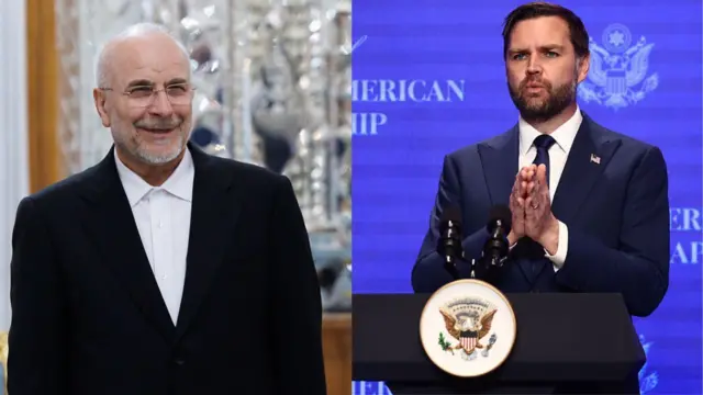 படக்குறிப்பு, பேச்சுவார்த்தைக்கான அமெரிக்க குழுவிற்கு துணை அதிபர் ஜேடி வான்ஸ் தலைமை தாங்கும் நிலையில் இரான் குழுவிற்கு அந்நாட்டின் நாடாளுமன்ற சபாநாயகர் முகமது பாகர் கலிபாஃப் தலைமை தாங்குகிறார்.
