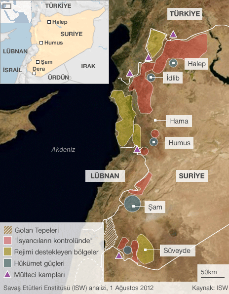İsyancıların fiilen kontrol ettikleri bölgelerin ise Halep'in kuzeyinde ve doğusunda ve İdlib ve Hama kentleri arasındaki ülkenin iç kesimlerinde olduğu belirtiliyor.