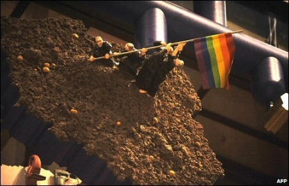 Polonya'da katolik rahipler eşcinsellerin sembollerinden gökkuşağı bayrağını dikerken yansıtılmış