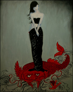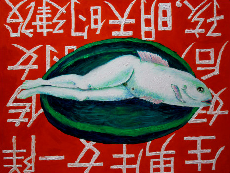 身为第一代独生子女的旅英中国艺术家金翱文在伦敦举办独生子女画展。这幅名为“血脉”的画将童话美人鱼的上下半身颠倒,象征妇女生育能力的重要性。