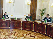 Думки розділилися стосовно того чи потрібно у парламенті створити нову ширшу коаліцію, чи розпустити Верховну Раду і провести нові вибори. Відкриваючи зустріч пан Ющенко сказав, що у центрі кризи опинилося становище у Верховній Раді і заявив про потребу процесу об’єднання. Учасники і зокрема Віктор Янукович, який очолює Партія Регіонів сказали, що готові працювати задля залагодження регіонального і політичного розколу України. Юлія Тимошенко, яка очолює одну з найчисельніших фракцій у парламенті, заявила, що виступає проти створення нової коаліції. Вона назвала теперішню Верховну Раду скомпрометованою і закликала до нових виборів, які вона назвала найкращим виходом зі становища. Окрім лідерів парламентських сил участь у круглому столі беруть колишній президент Леонід Кравчук, колишній голова Верховної Ради Іван Плющ, ветеран правозахисник Євген Сверстюк, академік Мирослав Попович та інші. | Також на цю тему Ющенко провадить круглий стіл з лідерами ВР27 липня, 2006 | УКРАЇНА Ющенко - за круглий стіл і проти тиску ВР26 липня, 2006 | УКРАЇНА НСНУ планує круглий стіл на четвер26 липня, 2006 | УКРАЇНА Ющенко запросив політиків за круглий стіл25 липня, 2006 | УКРАЇНА Антикризова коаліція викликає президента у ВР25 липня, 2006 | УКРАЇНА Депутати БЮТ складають свої повноваження24 липня, 2006 | УКРАЇНА Вибігає 60 днів роботи Верховної Ради24 липня, 2006 | УКРАЇНА Ющенко вважає нову коаліцію 'незаконною'13 липня, 2006 | УКРАЇНА | ||||||||||||||||||||||||||||||||||||||||||||||||||||||||||||||||||||||||||||||||||
