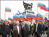 Разом з тим , на думку екс міністра, українські позиції послаблюються і у зв’язку із загальною ситуацією на півострові. Геннадій Удовенко: Реваншистські кола в Криму піднімають сьогодні голови, тому що вони розраховують на підтримку певних російських кіл. Дії російського Чорноморського флоту спрямовані не тільки проти України, її територіальної цілісності. Сьогодні йде поширення боротьби з кримськими татарами, посилюються антиєврейські настрої. Все це – для того, щоб дестабілізувати ситуацію. У зв’язку із відзначенням річниці флоту свої акції проводять і проросійські організації, які мають антиукраїнське забарвлення. В Криму представники маловідомої організації Російська співдружність вже почали акцію В кожному вікні російський прапор. Людям роздають російські символи і георгіївські стрічки. Блок НУНС заявив, що масове розвішування російських прапорів активізує антиукраїнські настрої і сіє ворожнечу між Україною і Росією. СБУ поки мовчить. | Також на цю тему ЧФ готовий до параду у Севастополі08 травня, 2008 | УКРАЇНА ЧФ планує парад попри заперечення Києва07 травня, 2008 | УКРАЇНА Київ застерігає Москву через навчання ЧФ06 травня, 2008 | УКРАЇНА МЗС застерігає Росію не губити ракети у Криму06 травня, 2008 | УКРАЇНА Преса: КПУ агітує за ЧФ у Криму05 травня 2008 | ПРЕСА НАТО втрачає своїх симпатиків в Україні24 квітня, 2008 | УКРАЇНА | ||||||||||||||||||||||||||||||||||||||||||||||||||||||||||||||||||||||||||||||||||