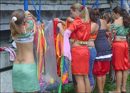 Молоді танцюристки готуються до виступу за лаштунками головної сцени ярмарку.