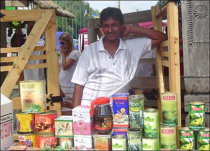 Колись в Сорочинцях продавали смалець та зерно, тепер - цейлонський чай та грузинське вино. Шріланкійський підприємець Ентоні Квін зі своїм крамом біля головного входу до ярмарку | |||||||||||||||||||||||||||||||||||||||||||||||||||||||||||||||||||||||||||||||||||