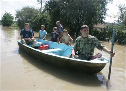 Люди пливуть на човні затопленою вулицею в одному з постраждалих від повені сіл в Івано-Франковській обл., 27 липня 2008. Фото УНІАН